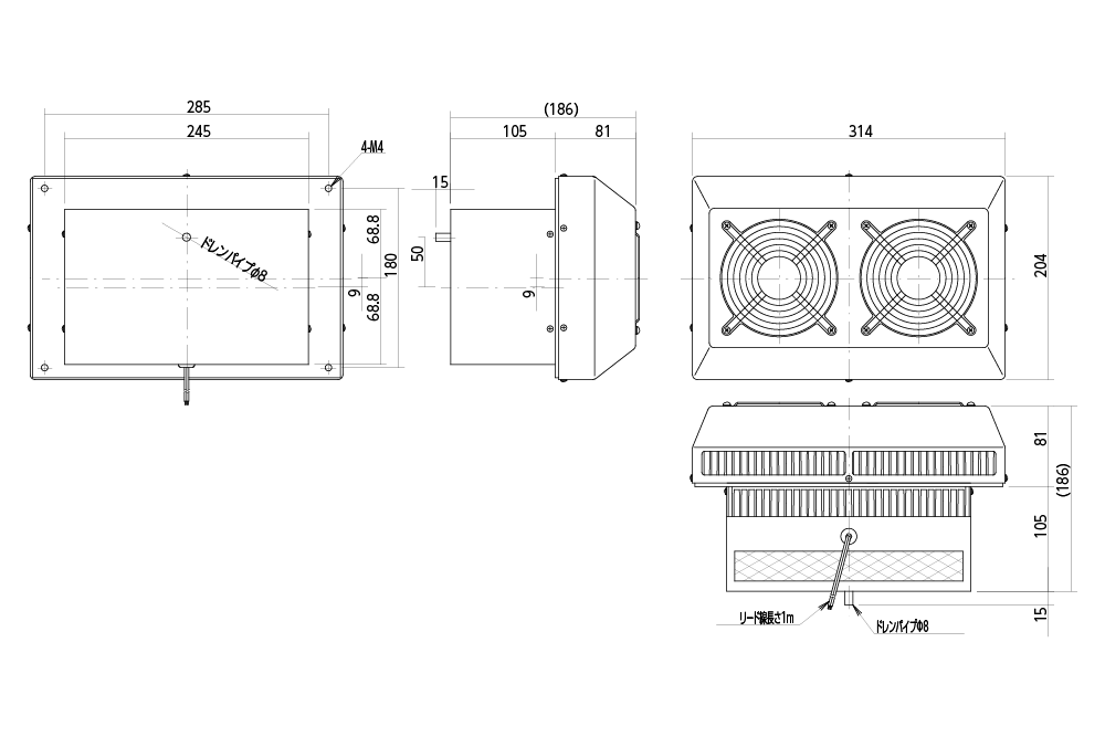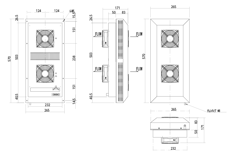 | 型番 | 取付位置 | 電源 | 冷却能力(△T=0) | 最大温度差(△t) | 使用温度範囲 | 使用湿度範囲 | 外形寸法 | 重量 |