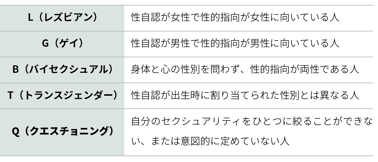 前述のLGBTにQを加えたLGBTQという言葉がセクシュアルマイノリティを表す総称のひとつとして使われることが多くあります。